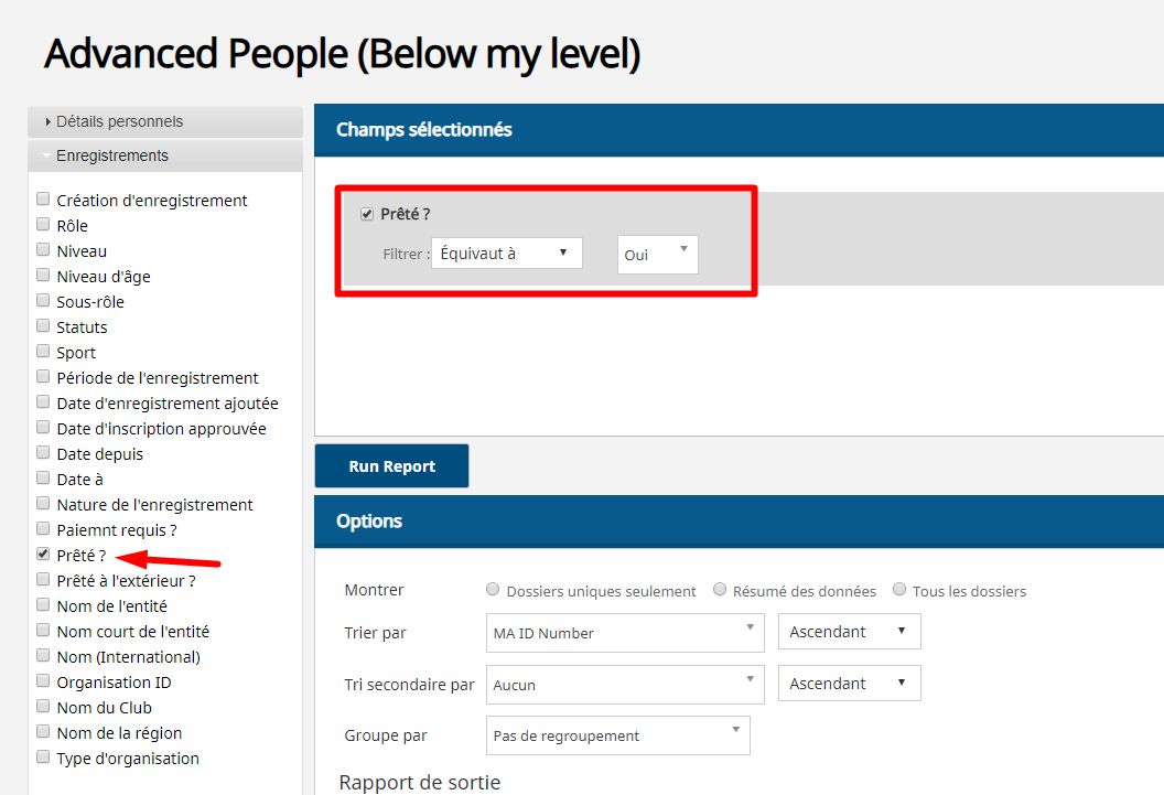 Pour utiliser les champs de rapport "Prêté à l’extérieur??" ou 'Prêté?', assurez-vous de filtrer ces champs pour qu'ils soient égaux à «Oui».