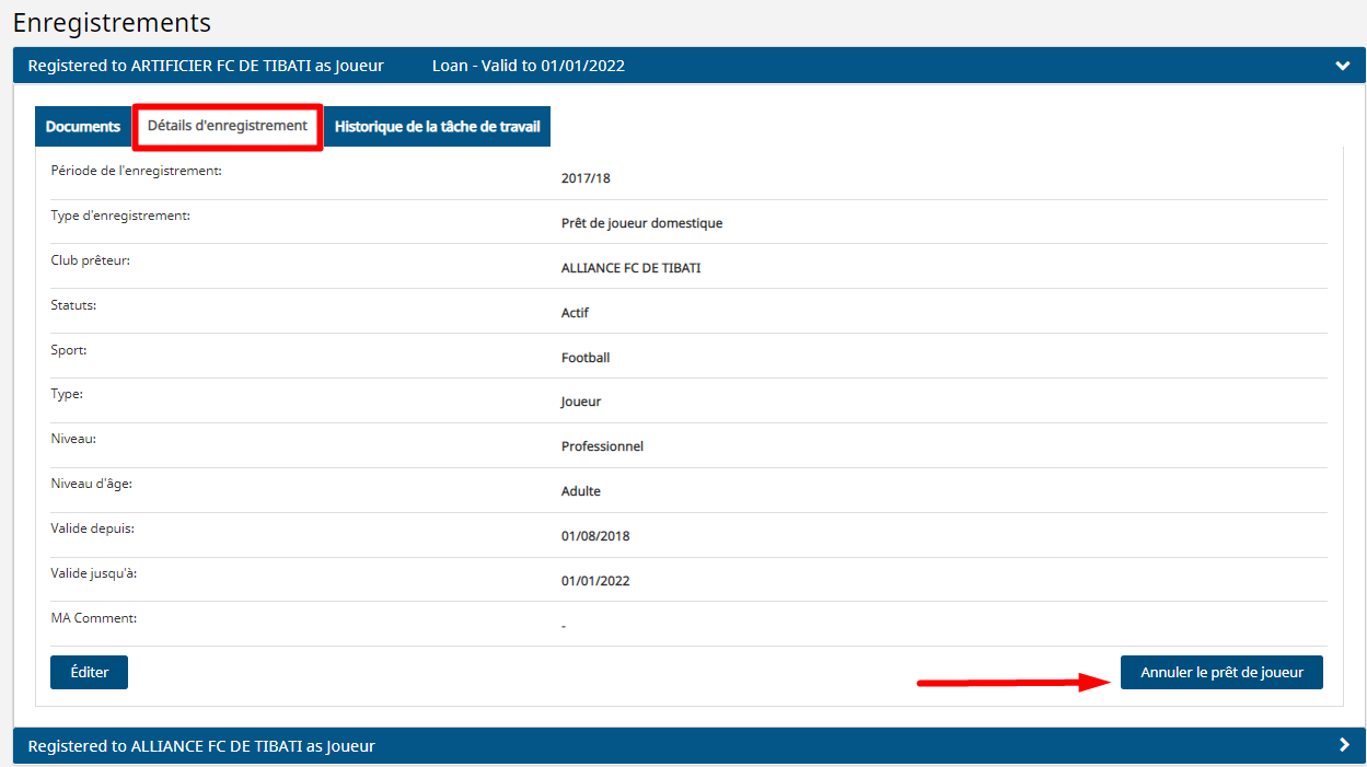 Après l’annulation d’un prêt, le club parent doit renouveler le joueur afin que son enregistrement redevienne actif. Cela peut être traité par la fédération en descendant au niveau du club parent pour renouveler le joueur.