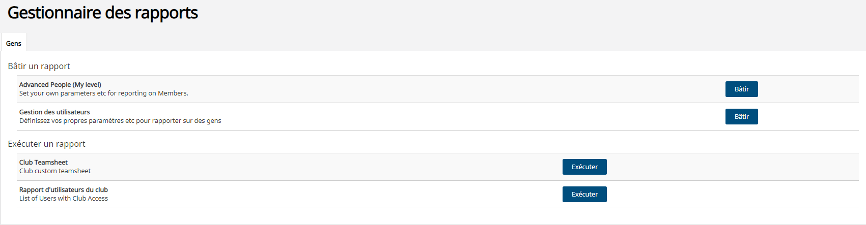 "Bâtir" un rapport vous permet de créer votre propre rapports. "Exécuter un rapport" vous permets d’exécuter un rapport crée par default ou précédemment enregistré.