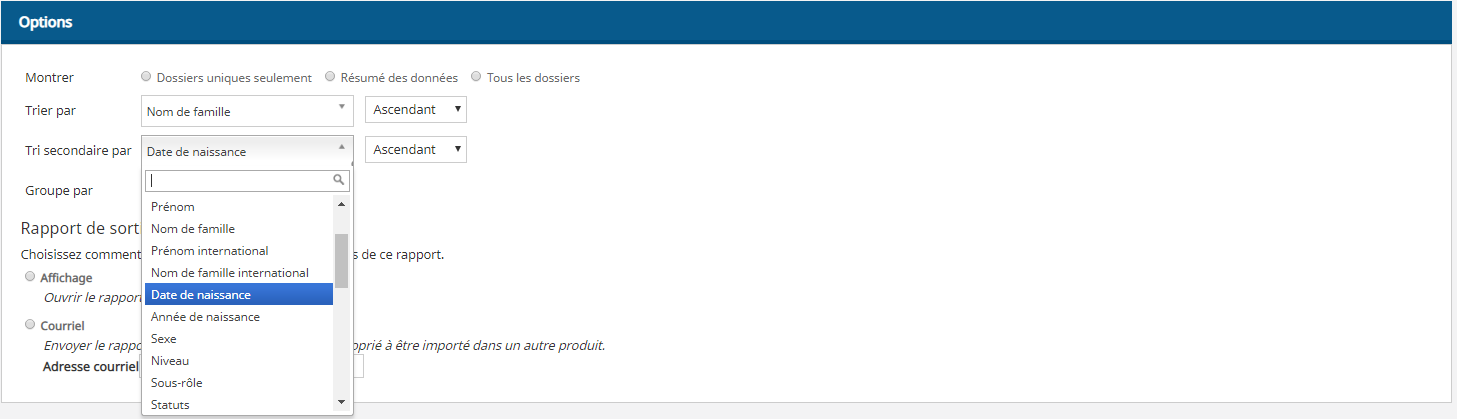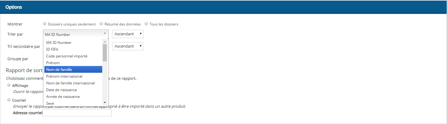Pour améliorer le rapport, vous pouvez choisir de "Trier par" le rapport (par exemple, le nom de famille alphabétique ou l'âge des joueurs les plus jeunes au plus ancien). Cela peut être fait en cliquant sur «Trier par» et en sélectionnant les options disponibles.