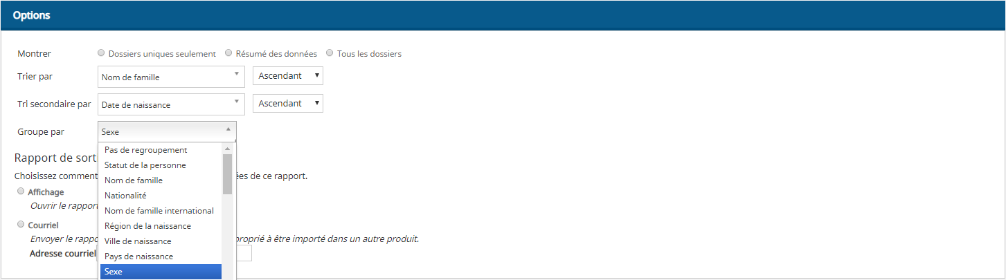 Sur certains champs, vous pouvez spécifier plus en détail ce que vous voulez que le rapport inclue, par exemple en sélectionnant le sexe comme champ sélectionné, vous pouvez ensuite spécifier le sexe pour le rapport en sélectionnant = masculin ou féminin.